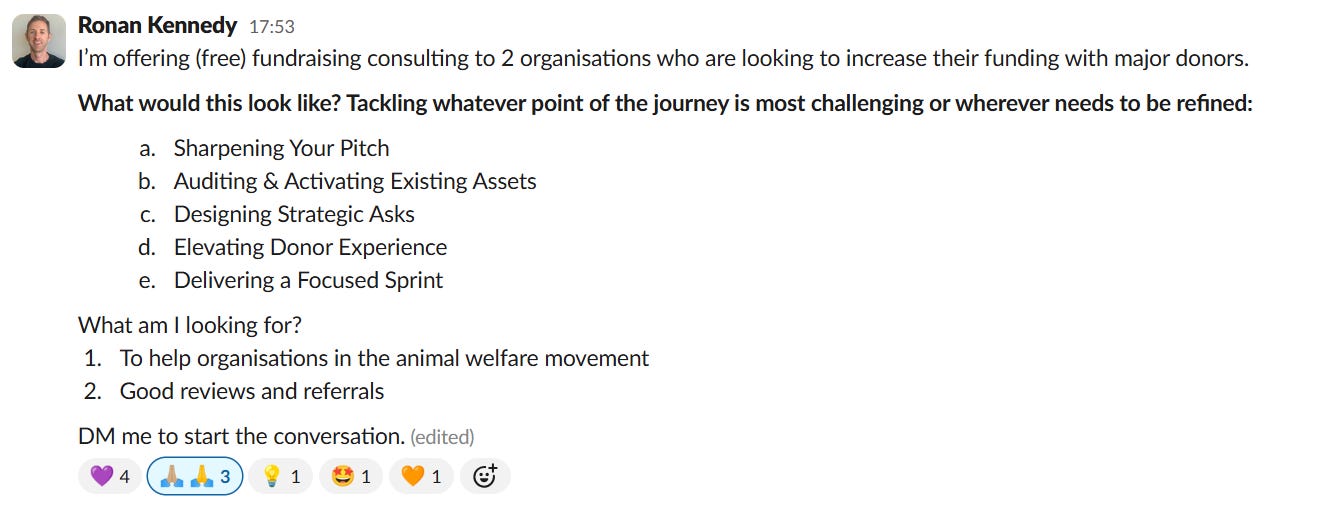 Ronan is offering (free) fundraising consulting to 2 organisations who are looking to increase their funding with major donors.