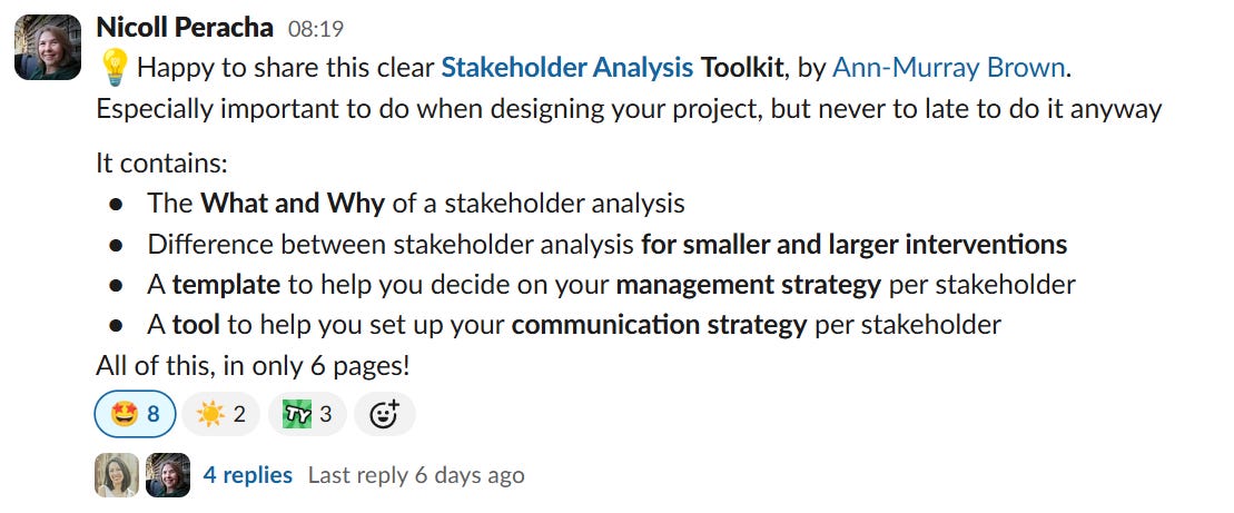 Nicoll shared a Stakeholder Analysis Toolkit, by Ann-Murray Brown.