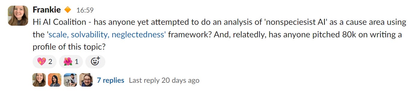 After @Frankie asked whether anyone has yet attempted to do an analysis of 'nonspeciesist AI' as a cause area using the 'scale, solvability, neglectedness' framework, and there was an incredibly insightful discussion in the threads!
