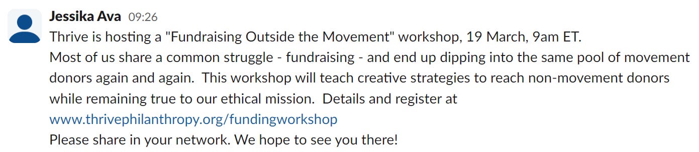 Thrive is hosting a "Fundraising Outside the Movement" workshop on 19 March.