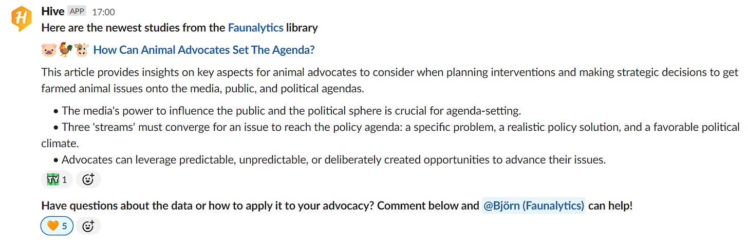 New Integration with Faunalytics 📚 We have set up a new integration to help you stay up-to-date with the newest studies from the Faunalytics Library! Once a week, new studies are shared in relevant, topic-based channels.